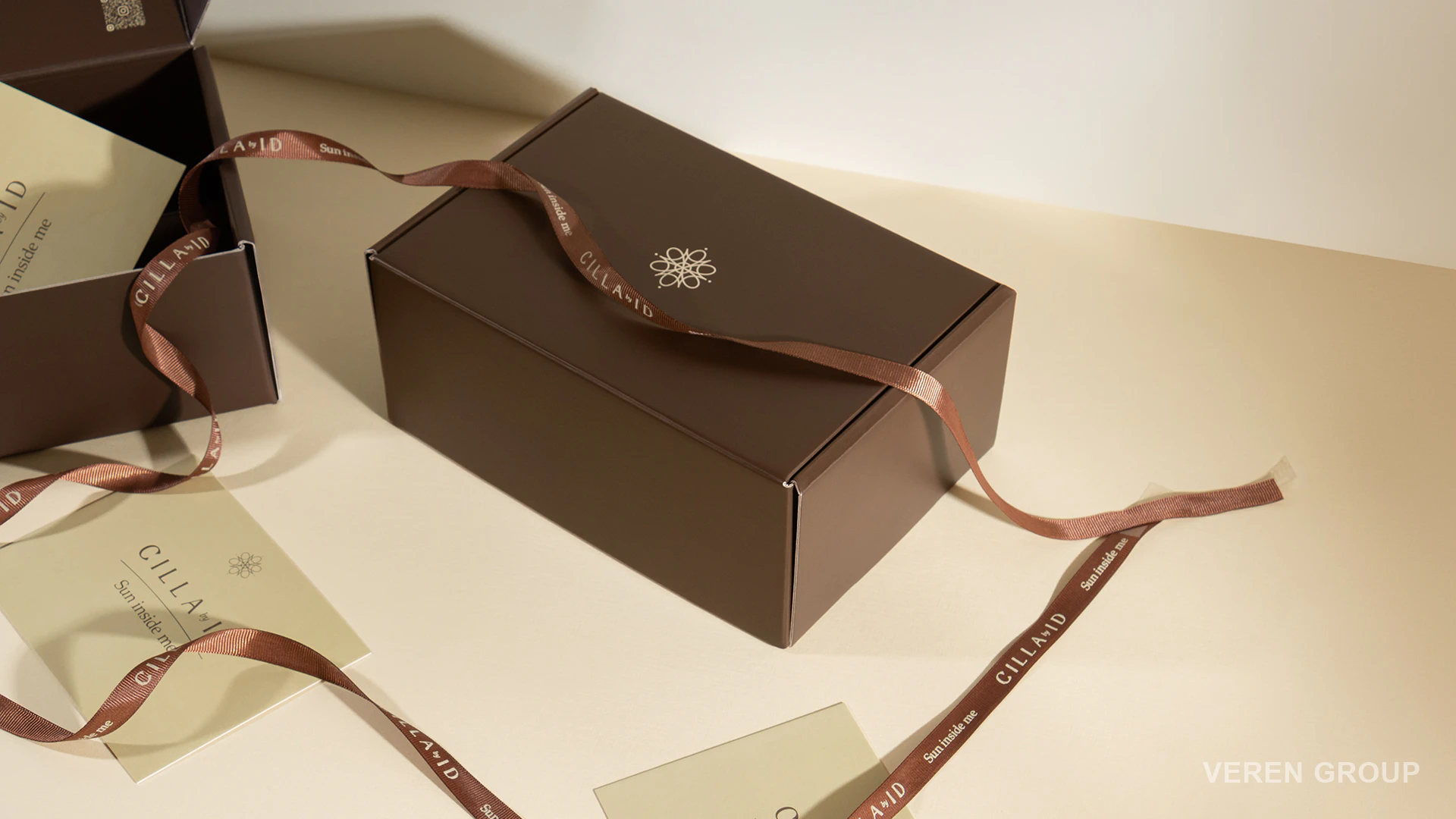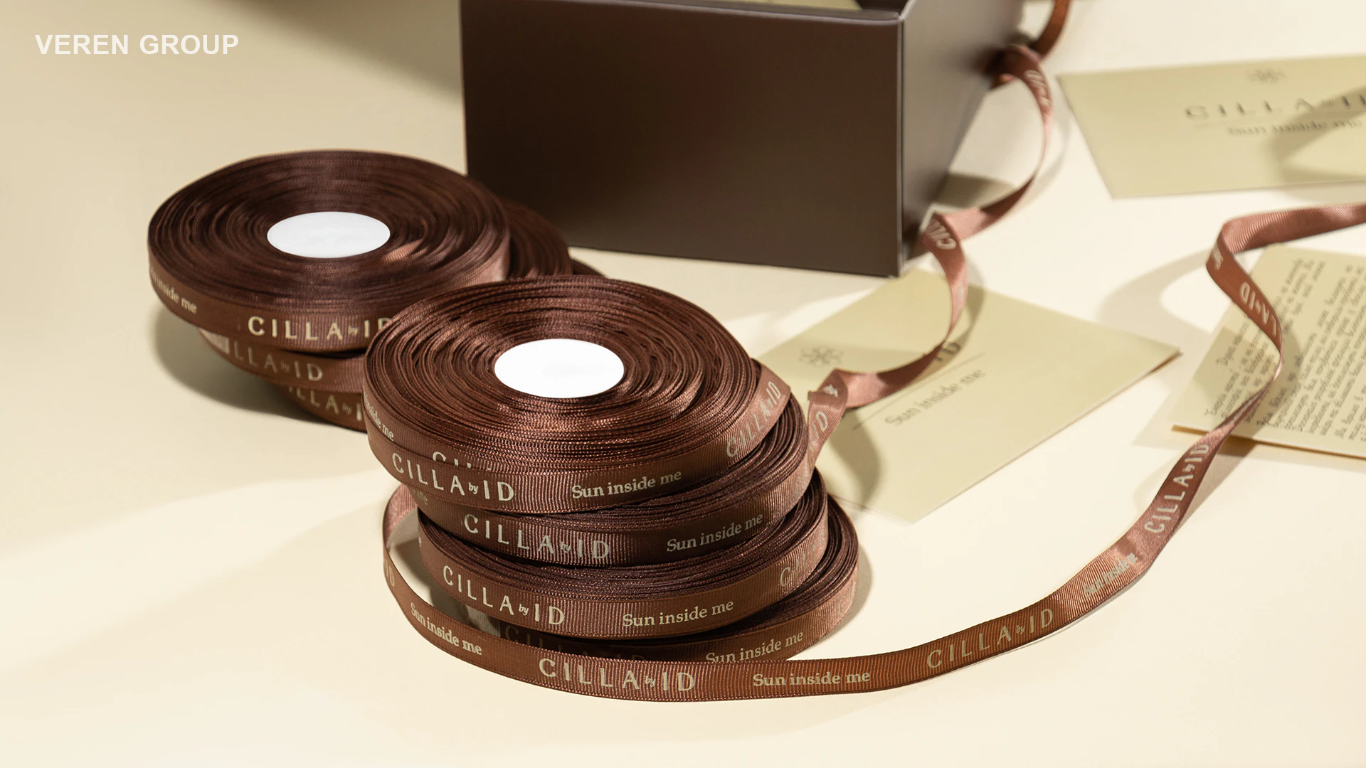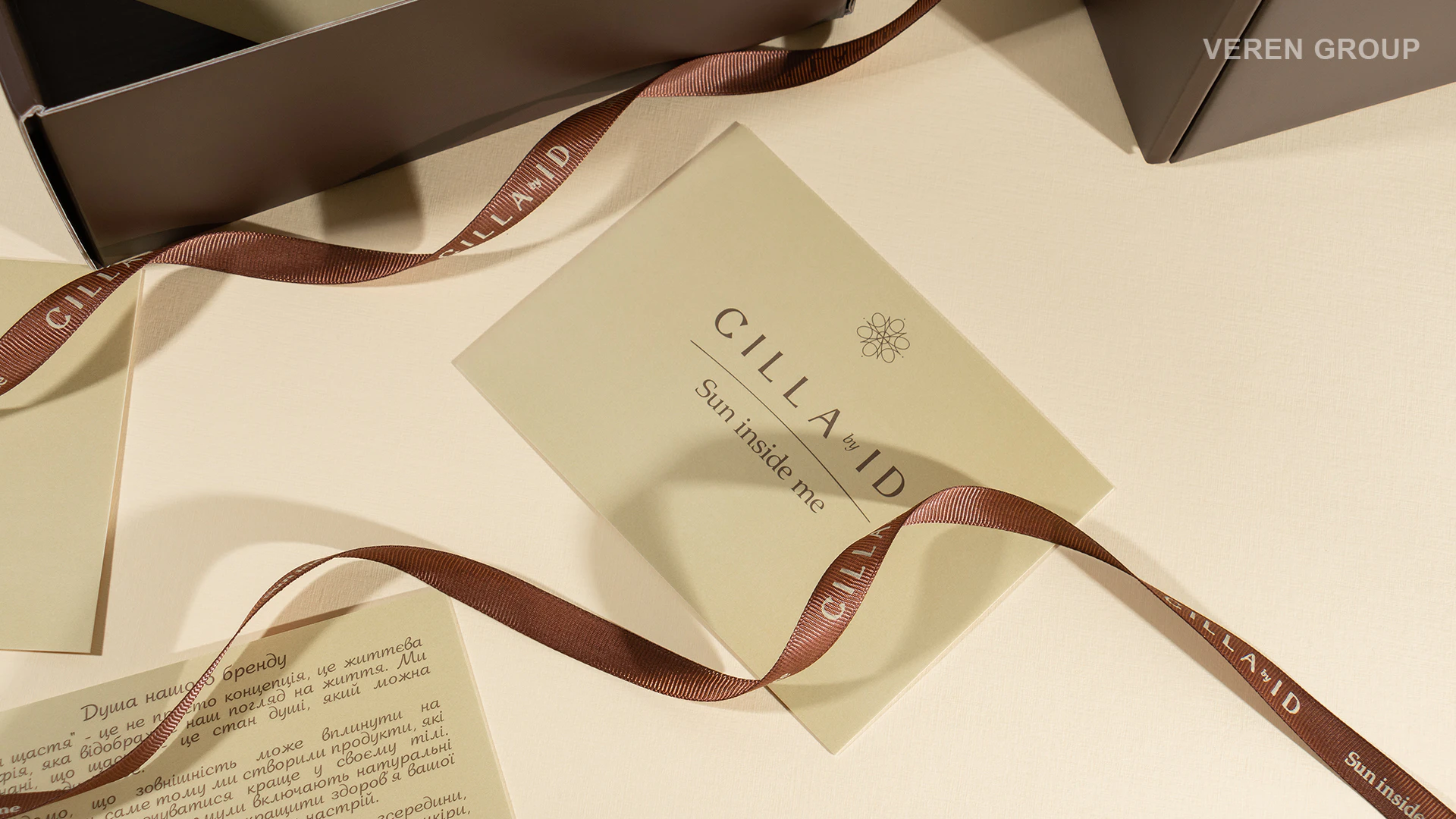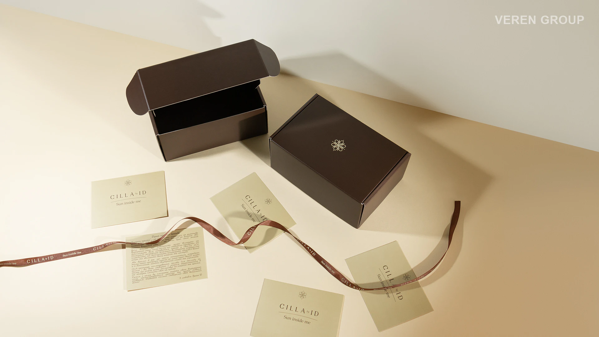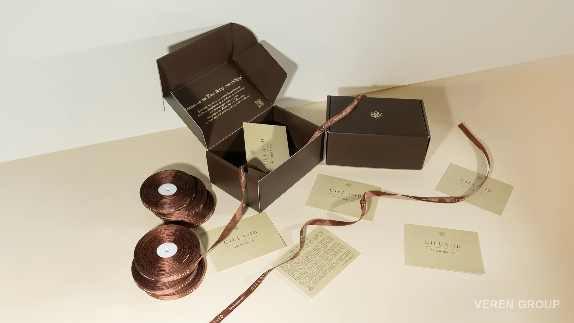 У межах проєкту було розроблено тішью папір із брендованим патерном, стрічку коричневого кольору з нанесенням логотипу бежевим та листівку з інверсійним дизайном до коробки. Кожен із цих елементів виконує не лише декоративну, а й комунікаційну функцію.